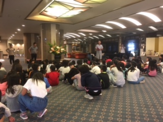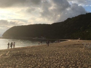 おはようございます。朝の会です。今日の天気は良さそうです。海に朝日が輝ききれいです。ホテルの近くの海岸を散歩しました。