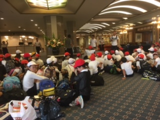 朝ご飯をしっかり食べて、部屋の片付けをして、ホテルを後にします。今から閉舎式です。今日は本当にいい天気です。みんな元気です。