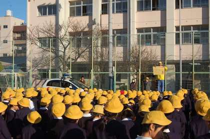 今日の児童朝会では、安全パトロールの方にお越しいただきました。