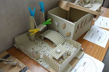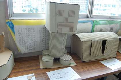 5年生の図画工作科題材「ダンボールで変身」の作品展を5年生教室前の廊下で行っています。家・キャンプ場・船などダンボールがいろいろな物に変身をしています。さすが高学年、見ごたがあります。