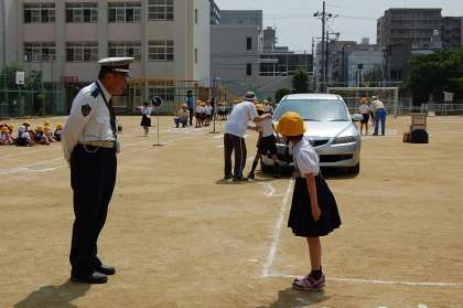 5月30日(金)に交通安全指導が行われました。東成区役所の安全パトロールと東成警察署交通課の方々より指導していただきました。