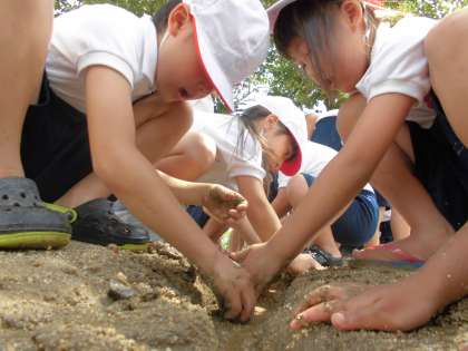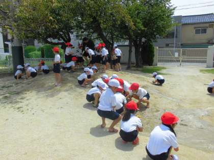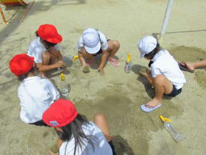 今日は生活科の一環で、運動場で泥んこ遊びをしました。水と土を混ぜて泥団子をつくったり、水を川のように流して、その流れを楽しんだりしました。「せんせい!おいしそうなコーヒーができたよ!」とペットボトルに混ぜたものを見せてくれました。気温が高く暑い一日でしたが、暑さに負けずに一年生は、みんな笑顔で元気に過ごしていました。
