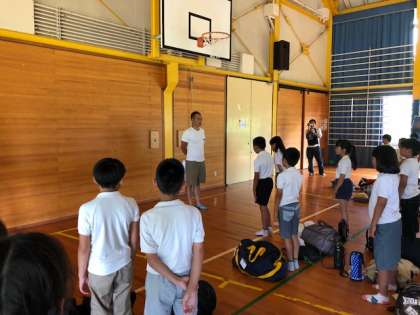 定刻より少し早めに青少年の家に到着しました。体育館で開舎式をしました。館の方から、自分の事は自分でする、そして友達と協力することというお話がありました。