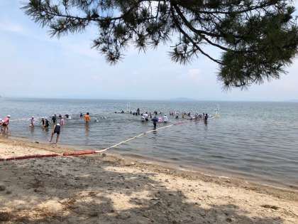 お楽しみの湖水浴です。プールの水より冷たくって気持ちいいです。あまり深くないよと楽しそうです。