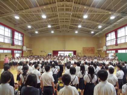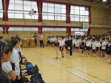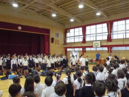 今日は6年生の修学旅行の出発式がありました。1年生から5年生の児童と教職員、保護者の方々でお見送りをしました。6年生の皆さんと付添いの先生方、修学旅行楽しんできてください。