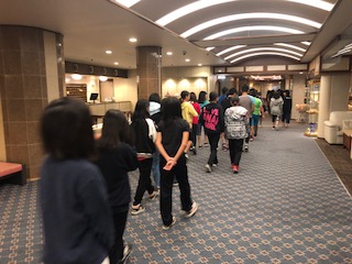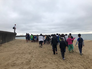 起床時間ギリギリまで寝ていました。みんな元気です。海をバックに学年で記念撮影をしました。