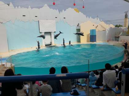 イルカのショーは、イルカが鳥のように宙を舞っていました。前の席に座ったみんなは、昨日みたいに、びしょびしょです。