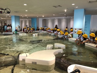 タッチプールでエイやサメを触りました。つるつるしてた。怖かった。と歓声いっぱいです。