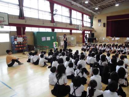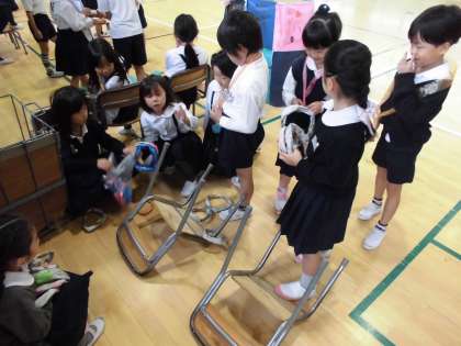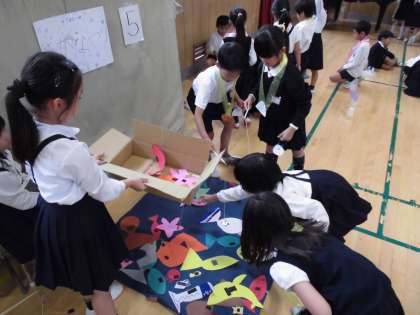 1・2年生が一緒に講堂でおもちゃまつりをしました。2年生が1年生のためにたくさんのお店やゲーム、景品などを用意して1年生を楽しませようとたくさんの工夫が施されていました。2年生はお兄ちゃん、お姉ちゃんとして1年生をしっかりとリードすることができました。1年生もたくさんのおもちゃで遊ぶことができて、とても楽しそうでした。