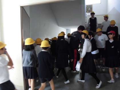 地震・津波の避難訓練をしました。「マグ二チュード8の大きな地震がありました。机の下に避難しましょう。」と放送の合図で子ども達は自分の机の下に避難します。運動場で体育の授業を受けていたクラスは建物から遠い、運動場の真ん中に集まって体を小さくして待機です。子ども達はおしゃべりなどせず、迅速に行動することができました。訓練の積み重ねが命を守ることにつながるような気がします。