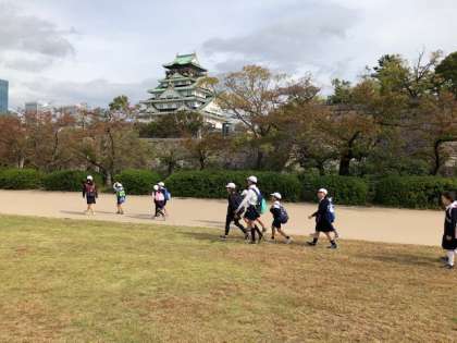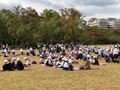 コーナーを全部回って、各班ごとにお弁当を、食べています。早く食べた班は、芝生の楽しく遊んでいます。