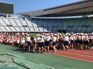 区内の6年生、600人が集まって100m走、サッカー、ドッチボールをします。公式の競技場です。しっかり楽しみたいと思います。