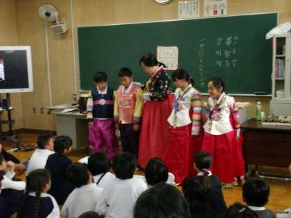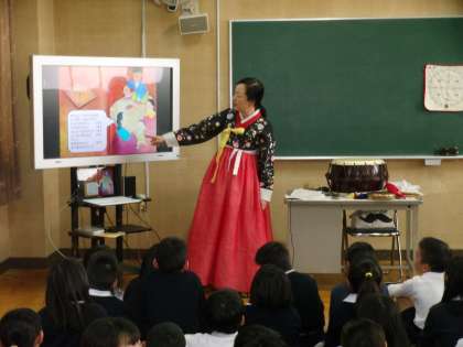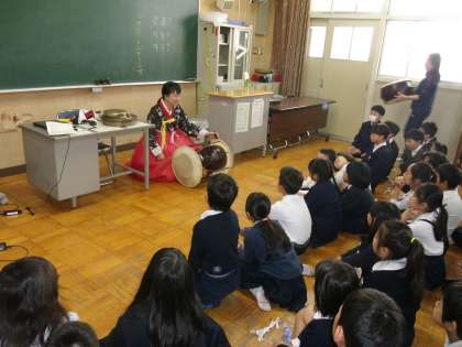 本日4年生が総合的な学習の時間に「おとなりの国 韓国について知ろう」という学習を行いました。ソンセンニムを講師に招き、楽器や衣装、遊びの紹介をしていただきました。実際に体験することにより、より理解を深めることができたようです。これからもいろいろな国に興味や関心をもってくれることを期待しています。