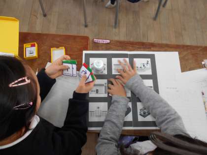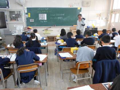 本日は、二年生で校長先生にロボットのトゥルトゥルを使った授業をしていただきました。ロボットが口に入れたカードのセンサーに反応し、前進したり回転したりと動いていました。児童は、目的の場所までロボットを動かせるために一生懸命思考していました。