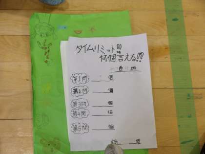 ふれあい班で協力して題目に会った言葉を何個言えるか「タイムリミット 何個いえる?」ゲームをしました。班長は、みんなが順番に回答できるように上手にサポートしていました。