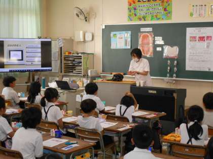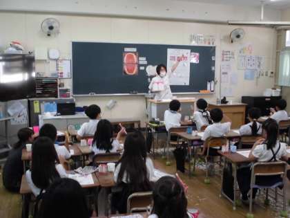 2年生も歯科医先生、歯科衛生士さんにる歯と口の健康教室の授業がありました。歯みがき名人になろうということで、みがく場所に応じた歯ブラシの持ち方やみがき方を教えていただきました。みがき残しがあったところを教えていただいたみがき方でみがきなおすと「歯がつるつるする」と声があがっていました。最後に歯が生えかわる大切な時期なので、しっかりと歯をみがいて大切にしましょうとお話がありました。