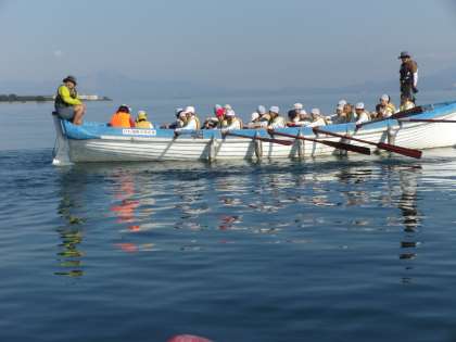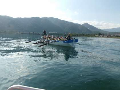 カッター体験の様子です。二人で1本の櫂(かい)を担当し、リーダーの号令に合わせて、みんなでそろえて漕いでいきます。櫂の長さは4mほどあり、上手く扱うことが難しかったようですが、次第に慣れ、楽しむことができました。湖面は穏やかで琵琶湖周辺の景色も堪能できました。