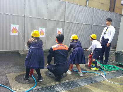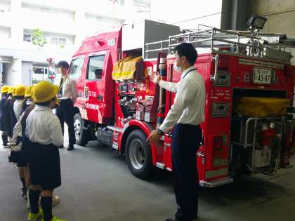 天候に恵まれ3年生は東成消防署に社会見学に行きました。消防署の仕事内容の動画を見た後、実際に防護服を着させてもらったり、空気ボンベを背負わせてもらったりして子どもたちは大喜びでした。さらに、救急車の中を見せてもらったり、消火器を使っての消火体験もさせてもらいました。いろいろな説明も消防士さんがクイズ形式で説明してくださったので、楽しく学ぶことができました。