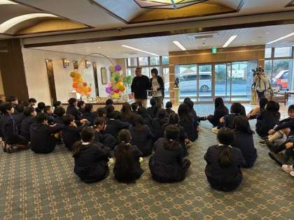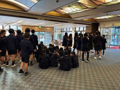 予定通り宿舎に到着しました。入舎式、避難訓練、記念撮影を終え、担任からの連絡を聞いています。次々と活動が進んでいきますが、時間を守って行動できています。さすが6年生です。