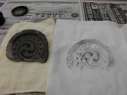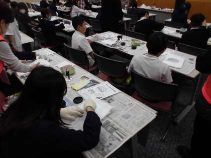 6年生が、大阪歴史博物館へ社会見学に行きました。クラスごとに分かれて、大阪城から出土した古い屋根瓦(本物!)から拓本を取る作業をしたり、博物館の地下にある難波宮遺跡の柱の跡などを見学しました。