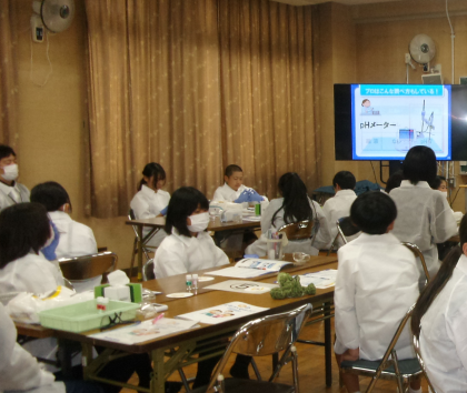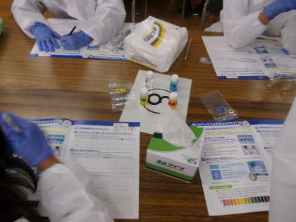 今年度も小野薬品工場の方々にお越しいただき、薬の秘密について授業をしていただきました。胃で溶ける薬、腸で溶ける薬の仕組みを実験を通して学習しました。子どもたちは、理科の学習で習ったことを思い出して、熱心にお話を聞いていました。