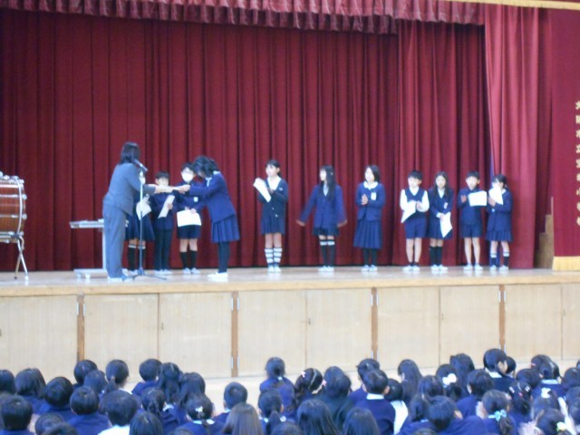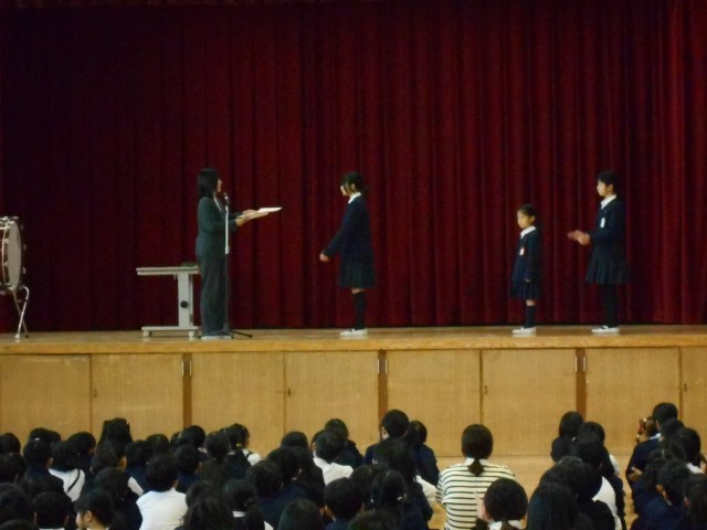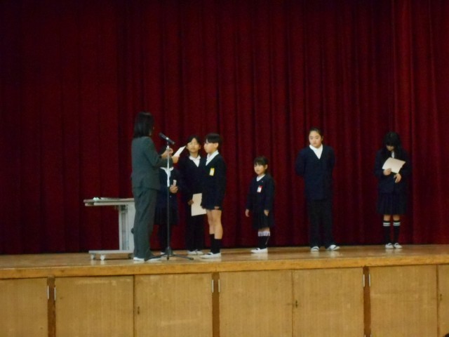 終業式の中で各表彰式を行いました。各クラスでこれまでこつこつと自主学習に取り組んだ児童を表彰しました。また、読書コンクール、税の習字とそれぞれの分野で活躍した児童の表彰も行いました。