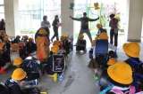給食が終わって、3クラスともピロティーに集合します。赤・黄・緑・青の4色のカエル...