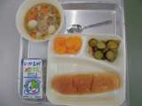 今日の給食は新メニューのおさつパン!