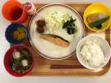 今日の朝ご飯は、焼き魚定食、肉団子付きです。オクラ好きという友達も。