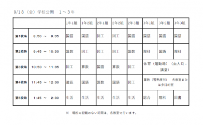 ★9/18(金) 学校公開〜1・2・3年〜の時間割