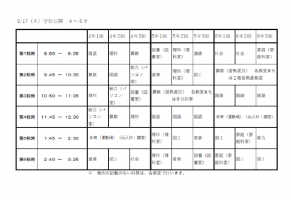 9月17日(木)の学校公開(4・5・6年)の 時間割をお知らせします。 ※18...