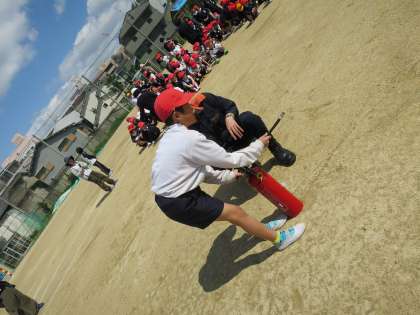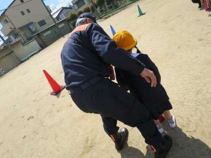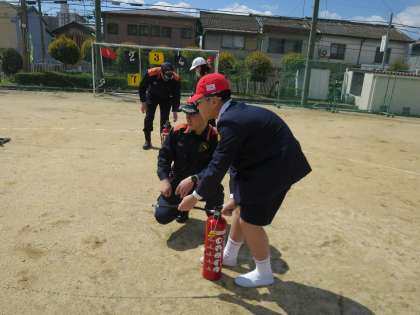 水消火器を使って、消火体験をしました!各学年3名ずつの代表者が体験します!消火器使用の合言葉は「ピン・ポン・パン」。火に見立てたコーンをねらって、上手に消化できるかなぁ〜