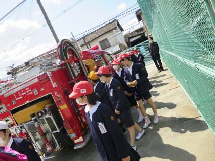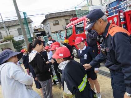 4年生は社会科の学習を兼ねてもう少し詳しいお話を聞かせていただきました!ブカブカの防火服を着てひとこと…「重た〜い。」ちょっぴり消防士さんのお仕事の大変さに触れることができました!^^