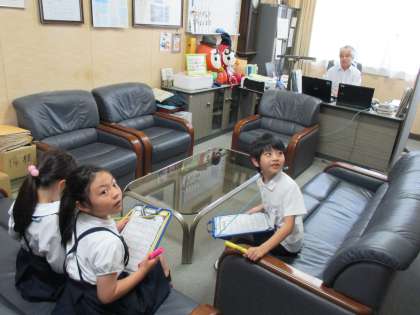 校長室では、校長先生から部屋の説明をしていただきました。これで1年生をばっちり案内できそうですね。校長室のソファに座らせていただき、うれしそうな2年生でした。