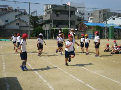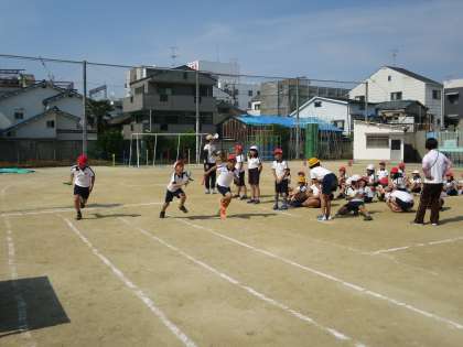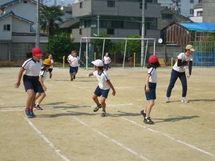 3・4年生合同でリレーの練習をしました。バトンパスのルールを教えていただき、いざ実践!1回目は、なかなかうまくいかなかったけど、2回目はスムーズにパスをすることができました。暑い中がんばっている子どもたちです。