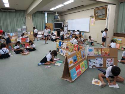 今、子どもたちの休み時間の過ごし方は「絵本広場」と「なわとび」が人気です。お気に入りの本を次から次へと読んだり、なわとびで色々な技に挑戦したりとみんな楽しく過ごしています。