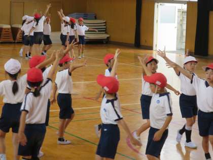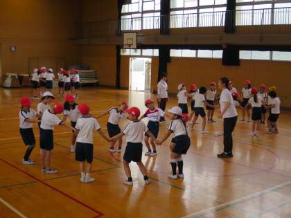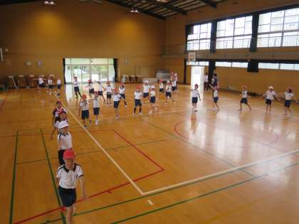 音楽に合わせて、隊形移動の練習中です。たくさんの移動がありますが、子どもたち、覚えるのが早いこと!やる気を感じます。