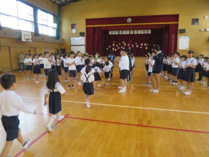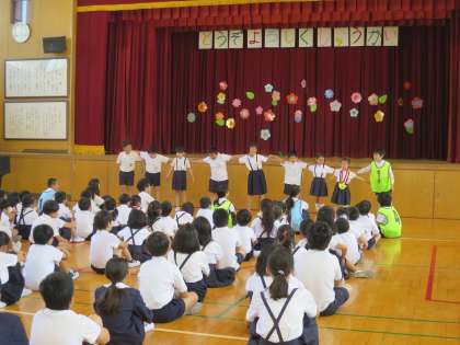 「どうぞよろしく集会」がありました。1年生1人1人に名前や好きな食べ物などをインタビューしたり、ふれ合いゲームをしたり、たてわり班のめあてを発表したりしました。これからどうぞよろしくね!。