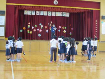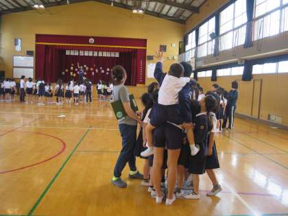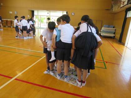 ふれあいゲーム(新聞乗りゲーム)は、大盛りあがりでした!班全員が新聞に乗れるように、高学年が低学年をおんぶしたり、片足で立ったり!楽しかったね(*^-^*)