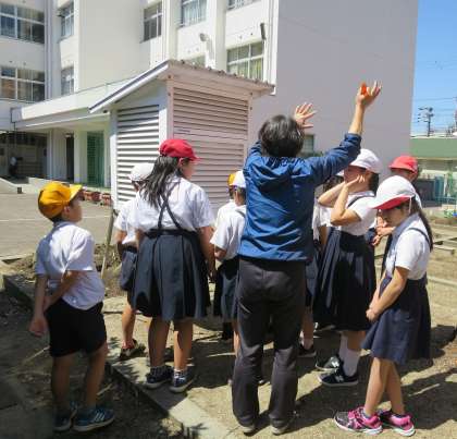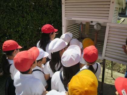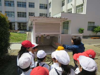 学校の中庭になる百葉箱を観察しました。教科書では見たことあるけど、本物の百葉箱の中を見るのは初めて!先生に中の器具の説明していただきながら、興味深そうに観察しました。