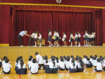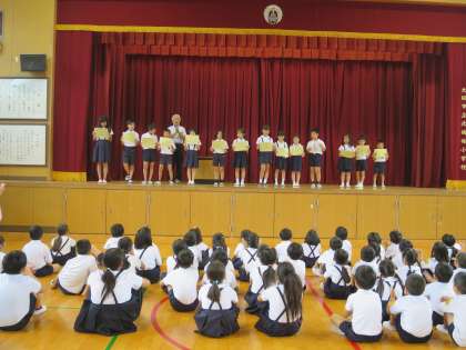 児童朝会で、先週のたてわり班遠足のオリエンテーリングの結果が発表され、1位の班全員に表彰状がおくられました。嬉しいね(*^-^*)