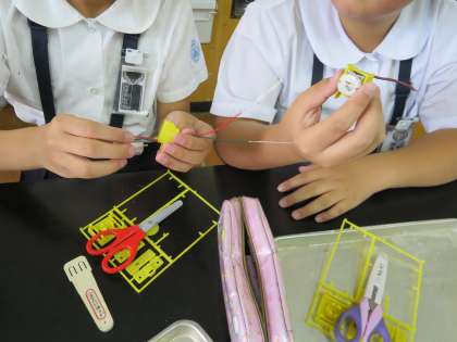 電気のはたらきを調べるために、プラモデルの車を組み立てています。先生の説明をよく聞かないと、複雑で迷ってしまいそう!!一つ一つ丁寧に切り離して組み立て中です。