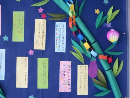 玄関には、4年生の作品が掲示されています。かわいくて素敵な七夕かざりです。一人一人が短冊に書いている願い事もじっくり読みたくなります!