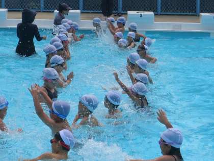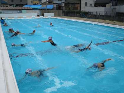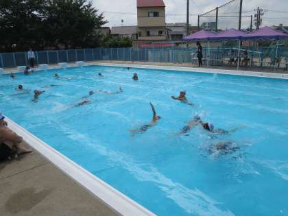 水慣れをした後は、自分の好きな泳ぎ方で泳ぐ練習をしました。そして泳力測定では、プールの縦のラインを使って、一生懸命泳ぎました。