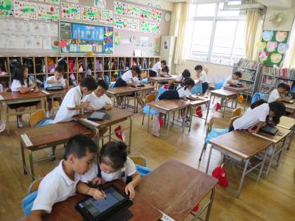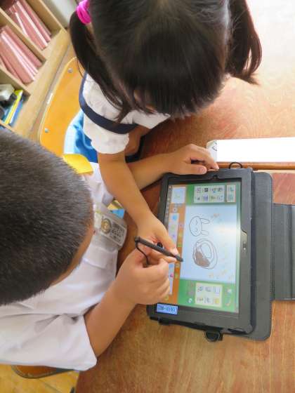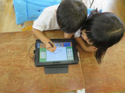 初めてのタブレットです!みんな早くさわりたくて仕方ない様子です!となりの友達と一緒にお絵かきを楽しみました。