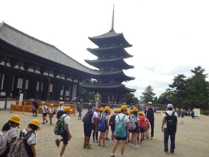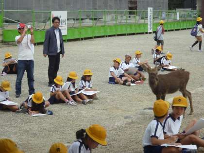 今日は、3・4年生が奈良公園に遠足に行きました。気持ちの良いさわやかな気候に恵まれて、五重塔を写生したり、公園を散策したり遊んだりしました。用意していただいたお弁当も、みんなで輪になっていただきました。普段見ている風景とは違い、自然が広がる風景も満喫できたようです。
