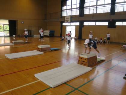 1段・2段・3段の跳び箱を使って、乗ったり下りたり、跳び越えたりしました。いろんな高さに挑戦できることも嬉しいようで、たくさん跳んで達成感もいっぱい!!