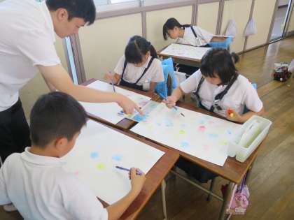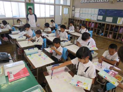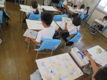 「ごんべえ」の背景を描きます。絵の具の黄色赤色青色を使って、薄く淡く水で調整しています。とっても淡くてきれいですね(*^-^*)