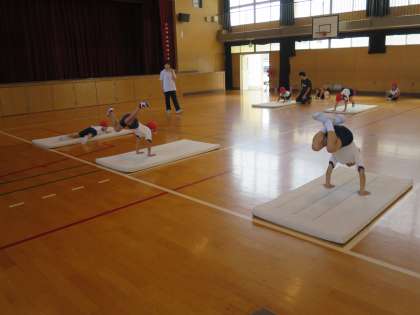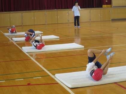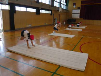 マットを使って、「うさぎとび」や「かえるとび」「だるまさんころがり」に「かえるあし」・・・などなど。いろいろなマット遊びに挑戦しました。