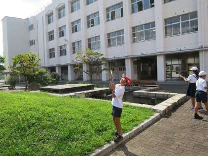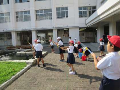 空気と水の性質を学習している4年生。今日は、閉じ込めた水を利用した水鉄砲を中庭でやってみました。筒に入れた水を思い切り押すと、水は勢いよく飛び出しました。暑かったので、少々水がかかっても大喜びでした!